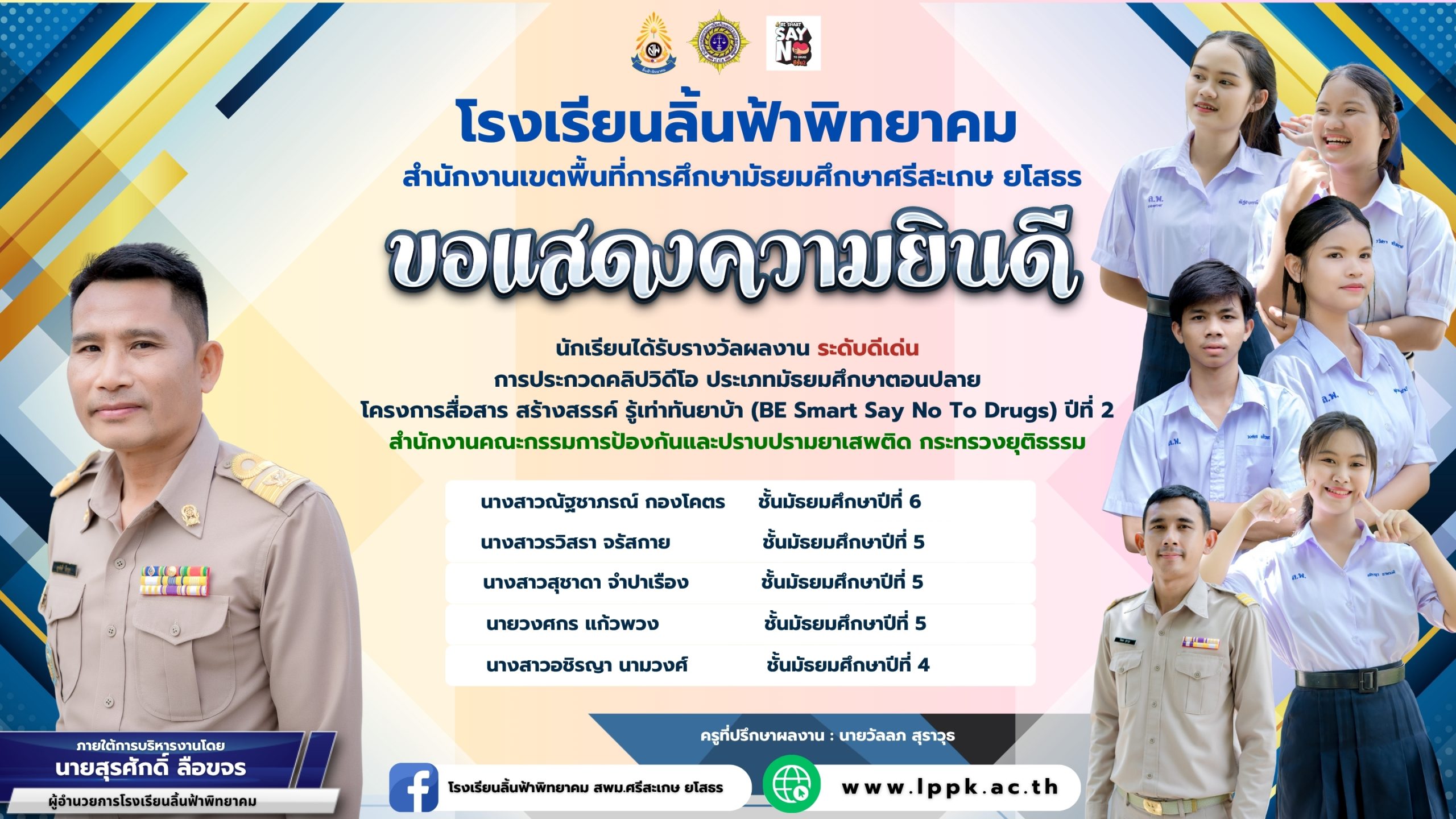 นักเรียนได้รับรางวัลผลงาน ระดับดีเด่น การประกวดคลิปวิดีโอ ประเภทมัธยมศึกษาตอนปลาย โครงการสื่อสาร สร้างสรรค์ รู้เท่าทันยาบ้า (BE Smart Say No To Drugs) ปีที่ 2 ของสำนักงานคณะกรรมการป้องกันและปราบปรามยาเสพติด กระทรวงยุติธรรม